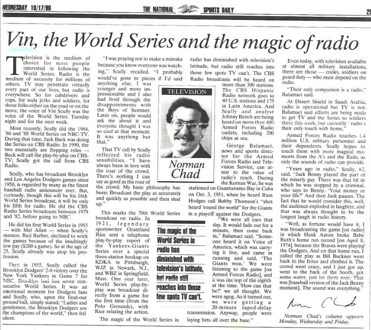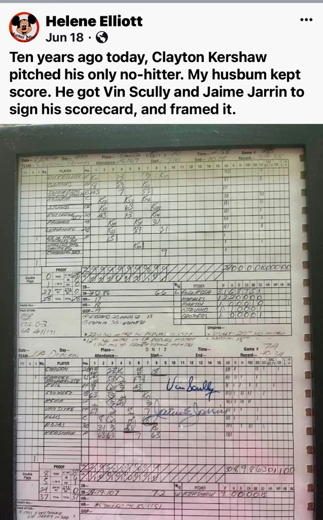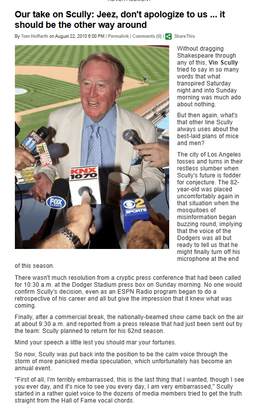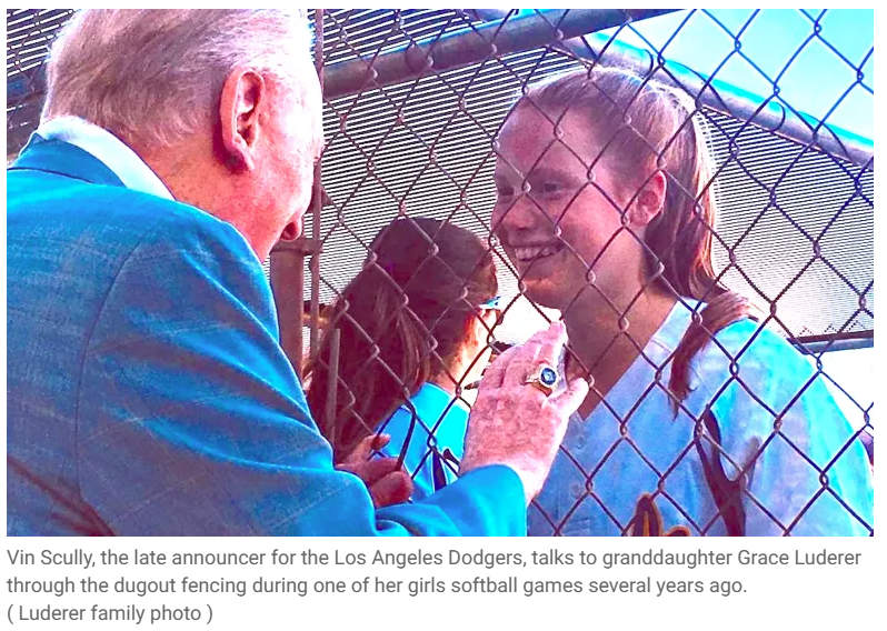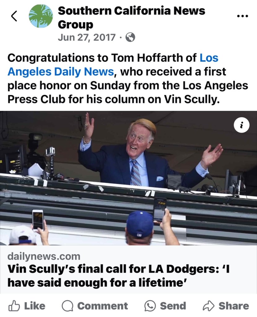 “My column was accompanied by a lovely photo of Vin Scully, from behind, as he called a night game at Dodger Stadium. … The photo by Dominic DiSaia perfectly demonstrated the link between Scully and his fans since the Dodgers moved to LA in 1958. (I’ve gotten over it; oh, yes, I’ve gotten over it.)