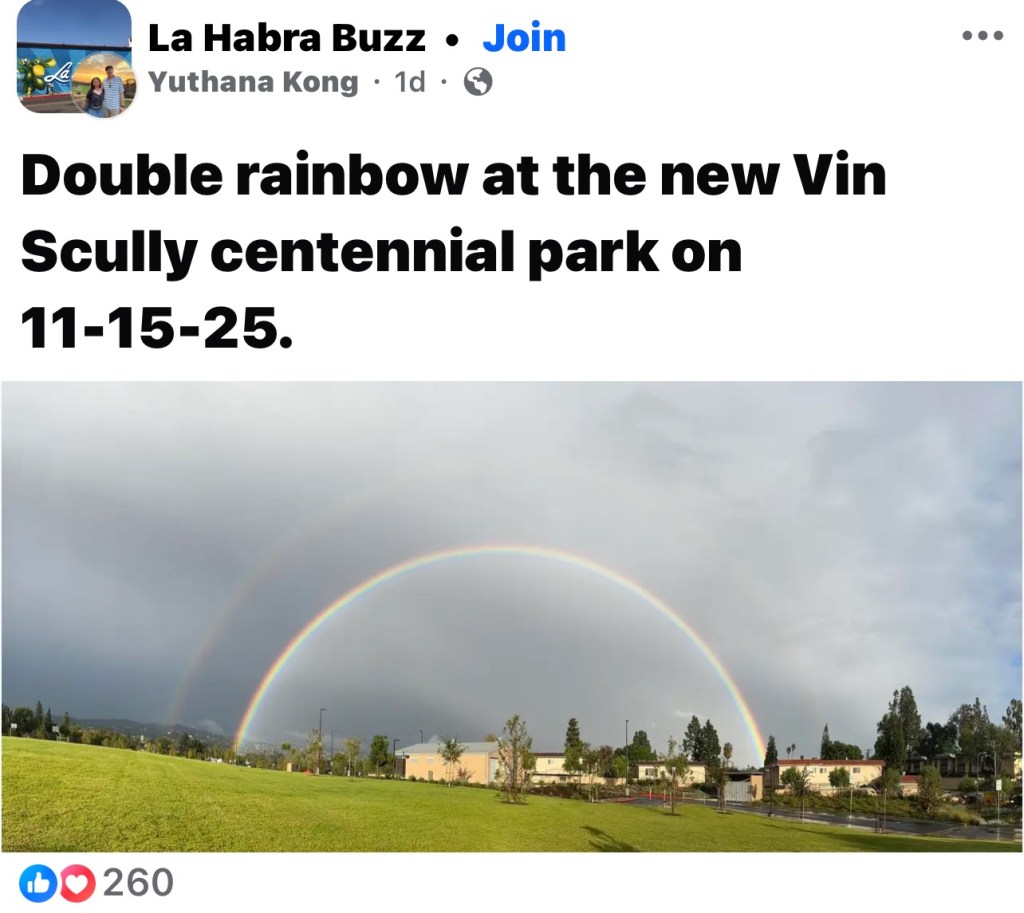 = Nov. 8, 2025: The city of La Habra rechristened a $9 million revamped public space on Las Lomas Drive as Vin Scully Centennial Park on an area that, back in 1960, had included Scully Stadium for its Little League and Pony League baseball fields.