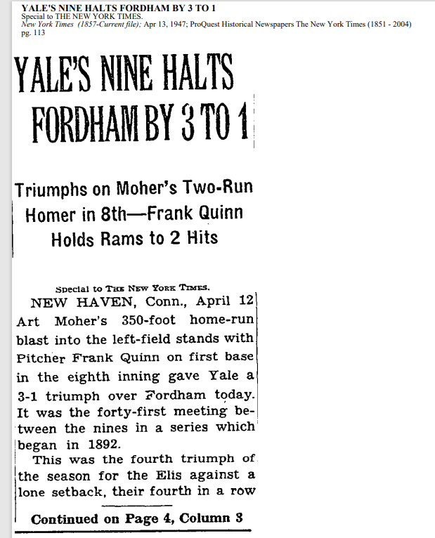 = April 13, 1947: Two days before Jackie Robinson’s debut with the Brooklyn Dodgers, Vin Scully’s Fordham team plays a game against Yale, which featured first baseman George H.W. Bush. The story and box score from the New York Times’ archive show Scully went 0-for-3 with four putouts in center field, while Bush went 0-for-4 with 10 put outs at first base.