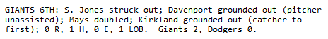 As for the rest of the game: It got more intense. The Dodgers’ seven-run sixth inning that allowed them to take a 7-5 lead still wasn’t enough. The Giants tied the game with two in the top of the eighth — during that rally, Willie Mays was thrown out trying to go from second to third on a run-scoring base hit. Tommy Davis, who had been playing center field, as Willie Davis was substituted out, was the one who threw Mays out. The Dodgers won in the bottom of the ninth when Ron Fairly hit a line-drive sacrifice fly to center field with the bases loaded to score Wills, who walked to start the inning. He went to second on a walk to Jim Gilliam, and was sacrificed to third on a bunt by Daryl Spencer — who pinch hit for No. 3 hitter Duke Snider for that sole purpose of bunting. Tommy Davis was walked intentionally to bring up Fairly, who subbed in earlier at first base for Wally Moon.