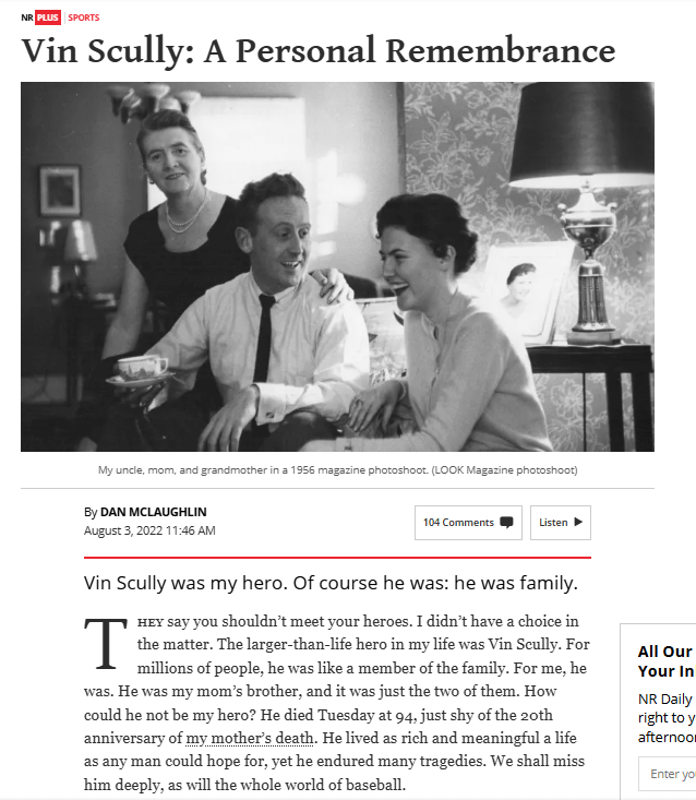 == Aug. 3, 2022: Dan McLaughlin, a Senior Writer for the National Review — and Scully’s nephew — posted a personal remembrance about his uncle’s passing that included a family find below:
