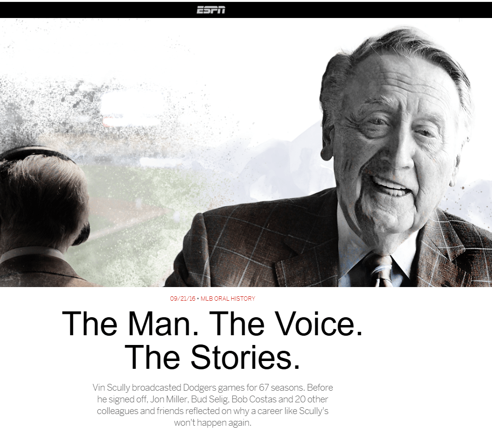 == Sept. 16, 2016: Jayson Stark (with help from Doug Padilla, Katie Strang and Doug Mittler) writes for ESPN an oral history of Scully’s career as retirement nears. He recruits Bob Costas, Charley Steiner, Bob Wolff, Orel Hershiser, Bud Selig and Tim McCarver. He also quotes Fred Claire, Ned Colletti, John Lowe, Dennis Gilbert, A.J. Ellis, Rick Monday, Jon Miller, Kirk Gibson, Jerry Reuss, Stan Kasten, Ron Cey, Bryce Harper, Justin Turner, Boyd Robertson, Rachel Robinson and Jaime Jarrin.