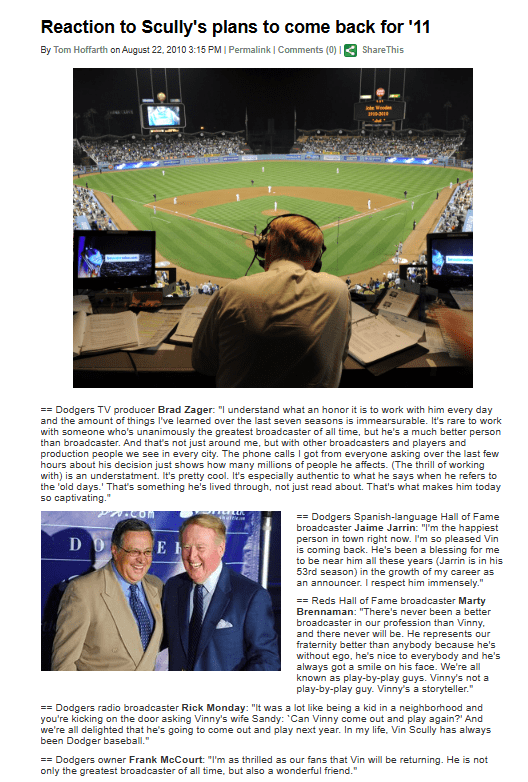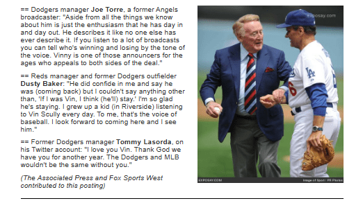 “The photo in the glowing night demonstrated the link between a grand franchise and the mellow, knowing, professional voice of Vince Scully. The fans in Dodger Stadium are one thing, but the audience ‘out there’ is also tangible.