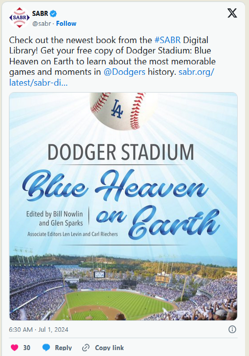 == July, 2024: The Society for American Baseball Research released a publication titled “Dodger Stadium: Blue Heaven On Earth,” and the focus of Chapter 13 written by Michael Green is titled ” ‘Scully’s Shrine’: A Broadcaster and His Ballpark.”