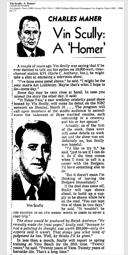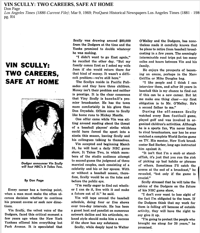 In the research for the book that could add depth and context about Vin Scully and his life, we found various published material that made it into the manuscript and other pieces that didn’t. Here we present and preserved more martial. Stories going back to the 1950s and beyond, and others posted most recently, continue top tell the Scully story (*links to the items are in the boldface in the dates):