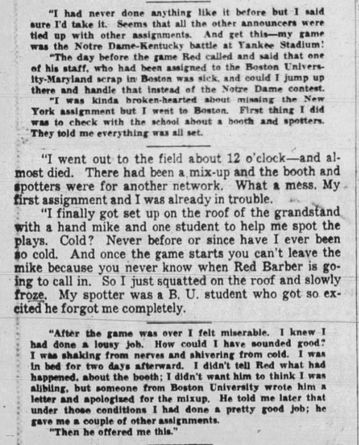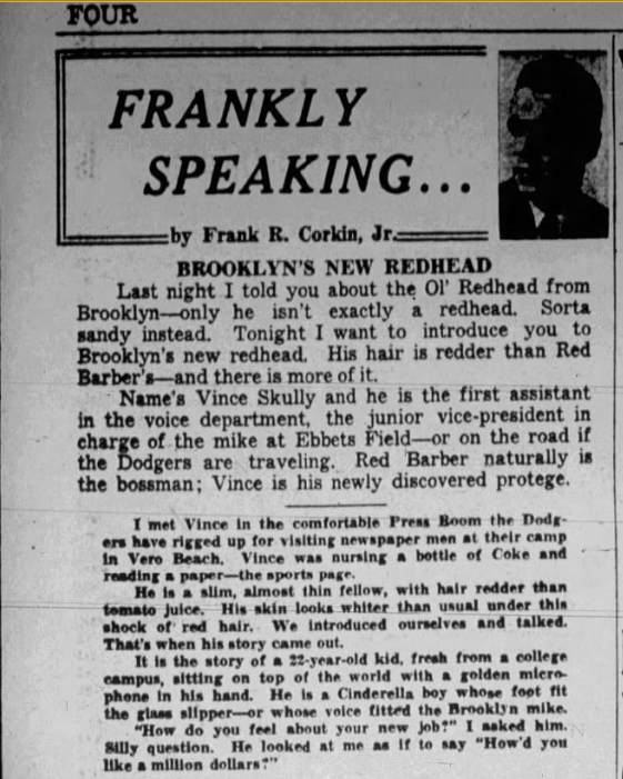 == March 24, 1950: The Journal of Meriden, Conn., ran a column by Frank Corkin that introduced readers to “Brooklyn’s New Readhead” — and then went on to misspelled his last name. It also kept with the trend of calling him “Vince” as his first name. Corkin also spelled it as “Skully” as he previewed the column with a piece about Red Barber the day before.