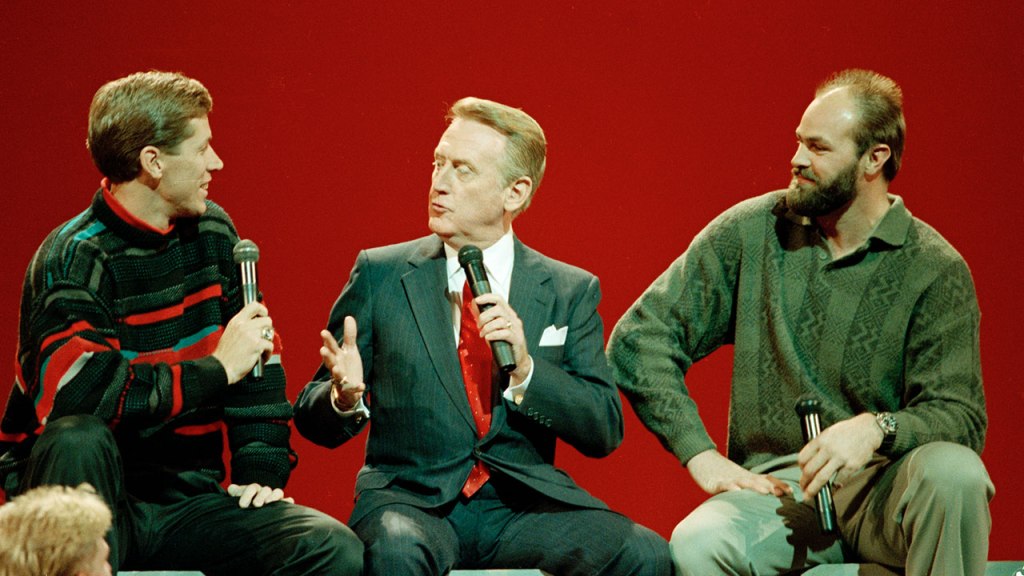 Vin Scully, center, with Orel Hershiser, left, and Kirk Gibson at a 1989 event.