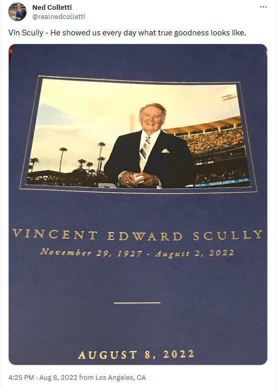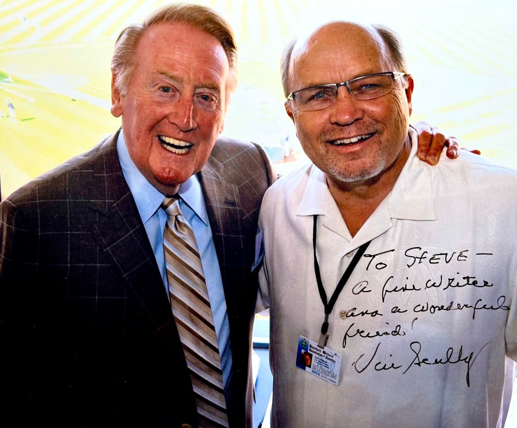 Dennis McCarthy: An award-winning columnist for the Los Angeles Daily News since 1982 and in the Southern California newspaper business for more than 50 years, out of San Fernando Valley State College in Northridge in 1971. Author of the 2011 book, “Here’s to the Winners.” His 2010 column about Scully included: The great ones … you want to remember them at the top of their game. Like Vin Scully still is at age 82.”