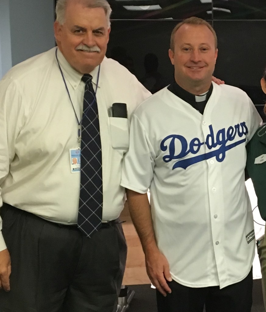 Brian Golden, left, with Fr. Tim Klosterman at a Dodger Stadium ballpark Mass in 2016. More background at this link.