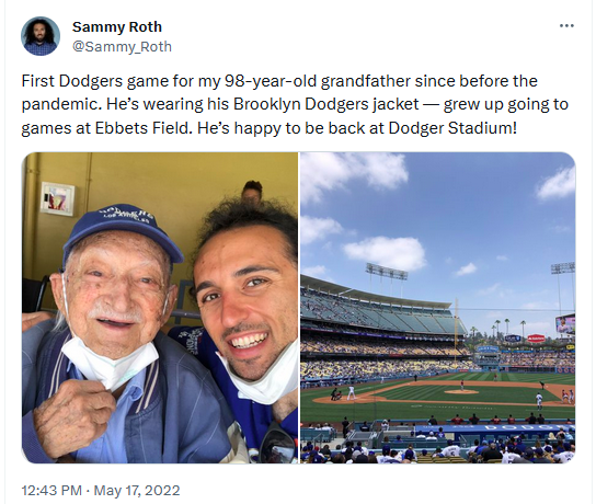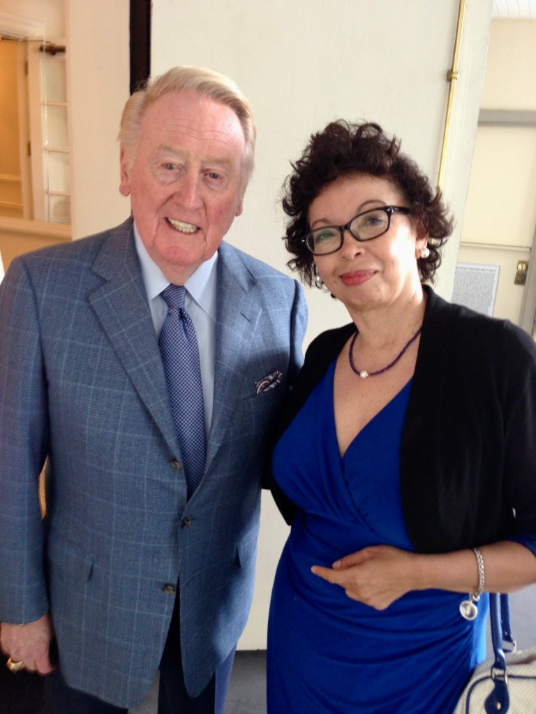 Emma Amaya: A retired computer programmer and analyst who works part-time in the Dodger Stadium team store. She was the 2013 recipient of the Baseball Reliquary’s Hilda Award and is a member of the Society of American Baseball Research.. In addition to her X (Twitter) social media account @crzblue, she also posts at  @Dodgershaiku with a daily haiku poem about the Dodgers games. Part of Emma’s essay recalls the time she saw Vin leaving the ballpark and was able to call out to him for a goodnight message. It was even recorded: