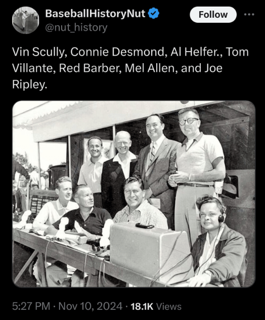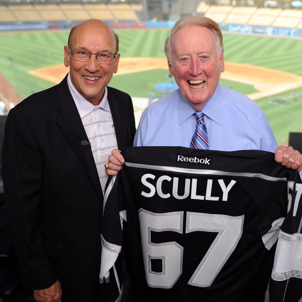 Bob Miller: The 2000 recipient of the Foster Hewitt Memorial Award given by the Hockey Hall of Fame, recognizing his work calling more than 3,300 games with the NHL’s Los Angeles Kings from 1973 until his retirement in 2017 — the year after Vin Scully retired. Miller’s education at the University of Iowa included playing on the school’s baseball team. He wrote Tales from the Los Angeles Kings in 2006, which was updated in 2013 after the team’s first Stanley Cup victory. He has a star on the Hollywood Walk of Fame, plus a statue outside Crypto.com Arena and a banner in his honor inside hanging from the rafters. Miller served as president of the Southern California Sports Broadcasters, which started in 1958 with Vin Scully as one of its first members. In 2018 Miller was given the SCSB’s Vin Scully Lifetime Achievement Award. He wrote “Tales from the Los Angeles Kings Locker Room: A Collection of the Greatest Kings Stories Ever Told(2006, updated 2013)