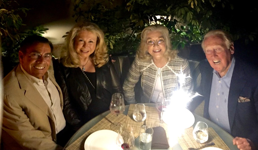 Dennis Gilbert and wife Cindy share a birthday dinner with Vin and Sandi Scully.