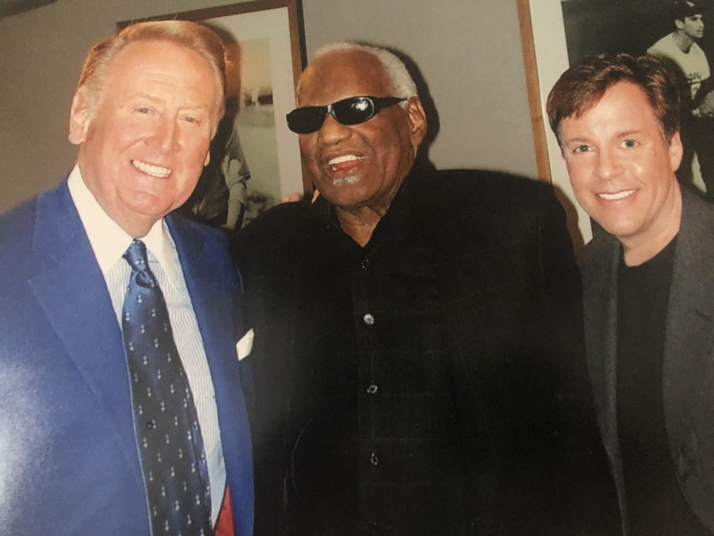 Musician Ray Charles, center, with Vin Scully, left and Bob Costas.