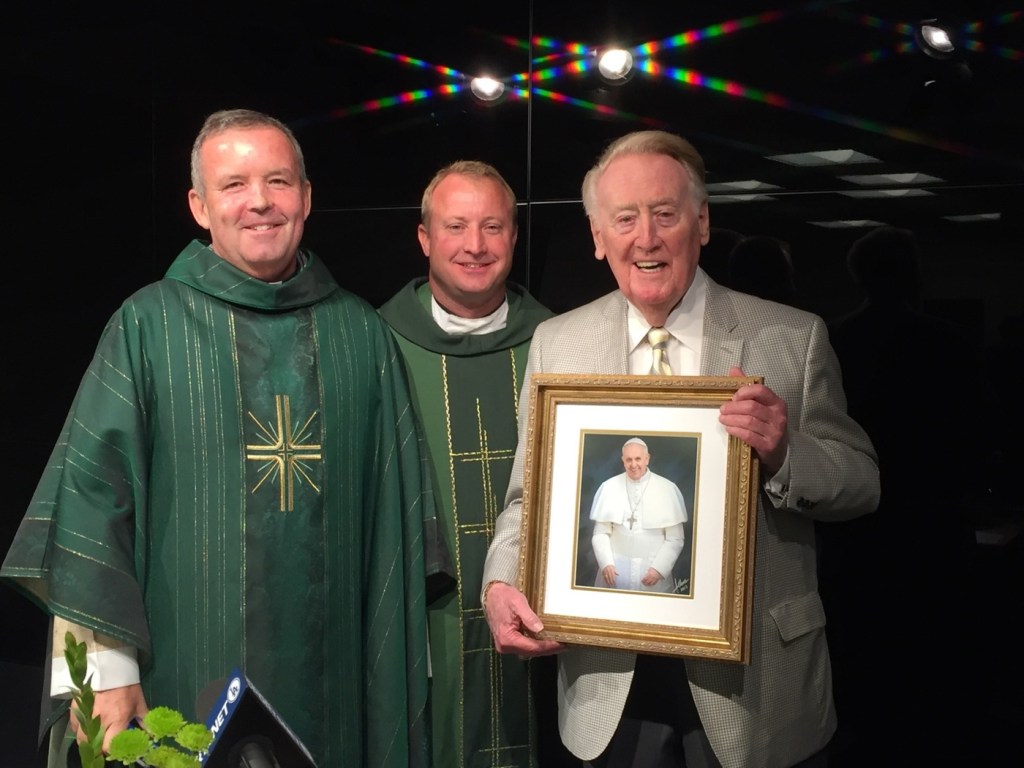 Fr. Tim Klosertman, center, with Fr. Steve Davoren, left, at Vin Scully’s final Dodger Stadium ballpark Mass in September, 2016, as they present him with a portrait of Pope Francis.