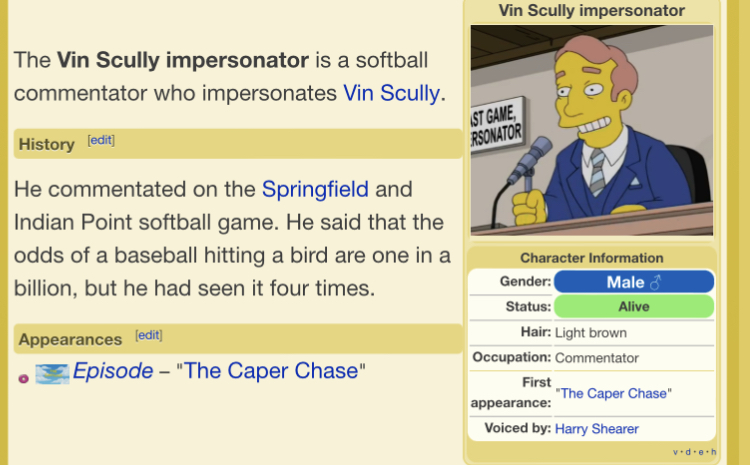 Harry Shearer: An Emmy Award–winning character voice on the television series “The Simpsons” since 1983, occasionally playing a baseball announcer that sounds particularly like Vin Scully. In Season 28, Shearer even voices the role of a character named Vin Scully Impersonator in an episode called “The Caper Chase” (2017). He co-wrote, co-created, and costarred in the 1984 film “This Is Spinal Tap.” His acting roles include “A Mighty Wind” (2003), “For Your Consideration” (2006), “The Right Stuff” (1983) and “The Truman Show” (1998). He was a writer and cast member on NBC’s “Saturday Night Live” from 1979 to 1985 — once doing a Scully character during the 1984 World Series as Bob Uecker was the SNL host. His work can be found at HarryShearer.com.